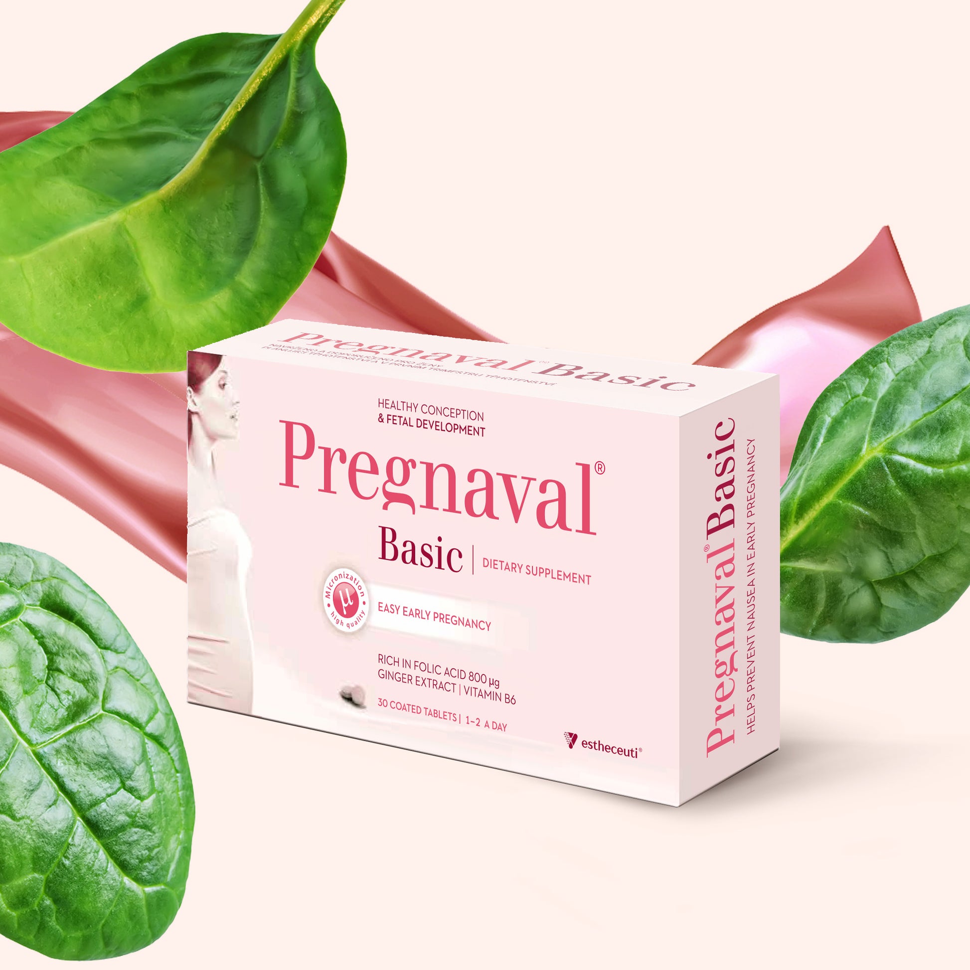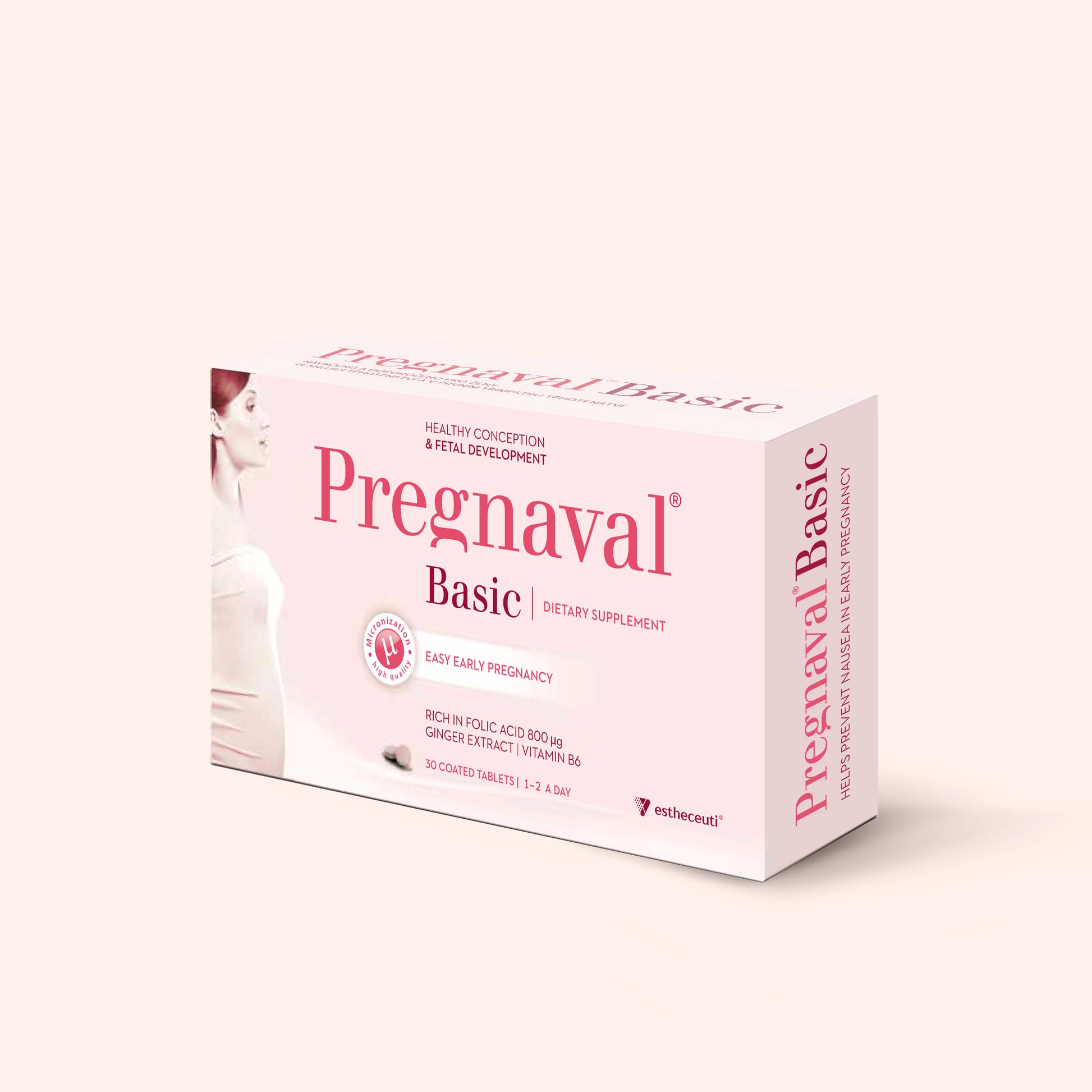 Pregnancy begins even before a pregnancy test confirms the happy news. It is important to give your body the right support even during the planning stage. And that is why we developed Pregnaval® Basic, as dietary supplement for women who are preparing for pregnancy or are in the early stages of pregnancy. At the heart of this product are two key vitamins – folic acid and vitamin B6. Adequate folic acid intake is recommended for all women planning to become pregnant. Vitamin B6 is known for its ability to help reduce fatigue and support hormonal balance. Pregnaval® Basic is also enriched with ginger extract, which is prized for its ability to relieve nausea. This is a common and unpleasant side effect of the early weeks of pregnancy.